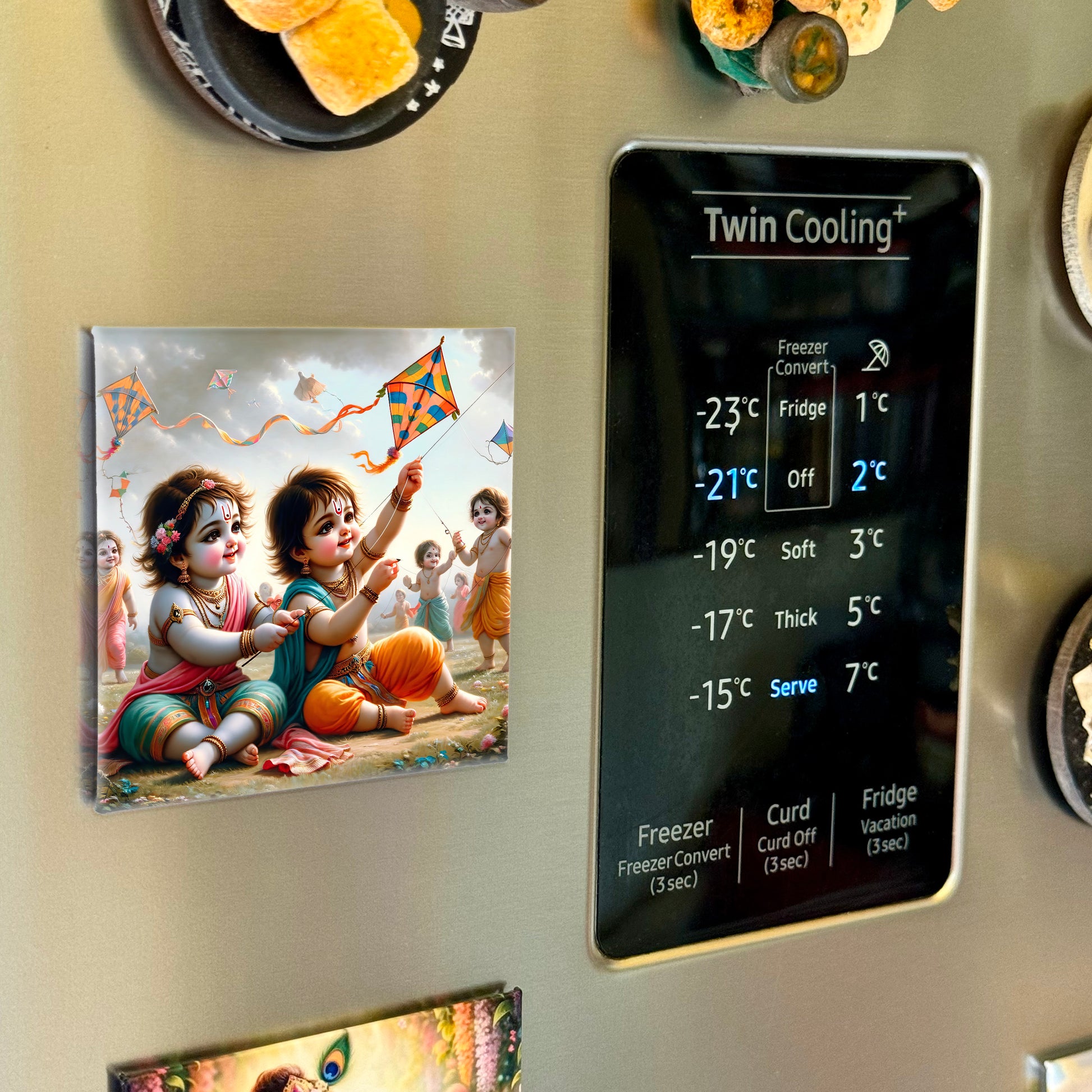 63mm Square Fridge Magnet of Lord Krishna and Balram flying Kite 110031